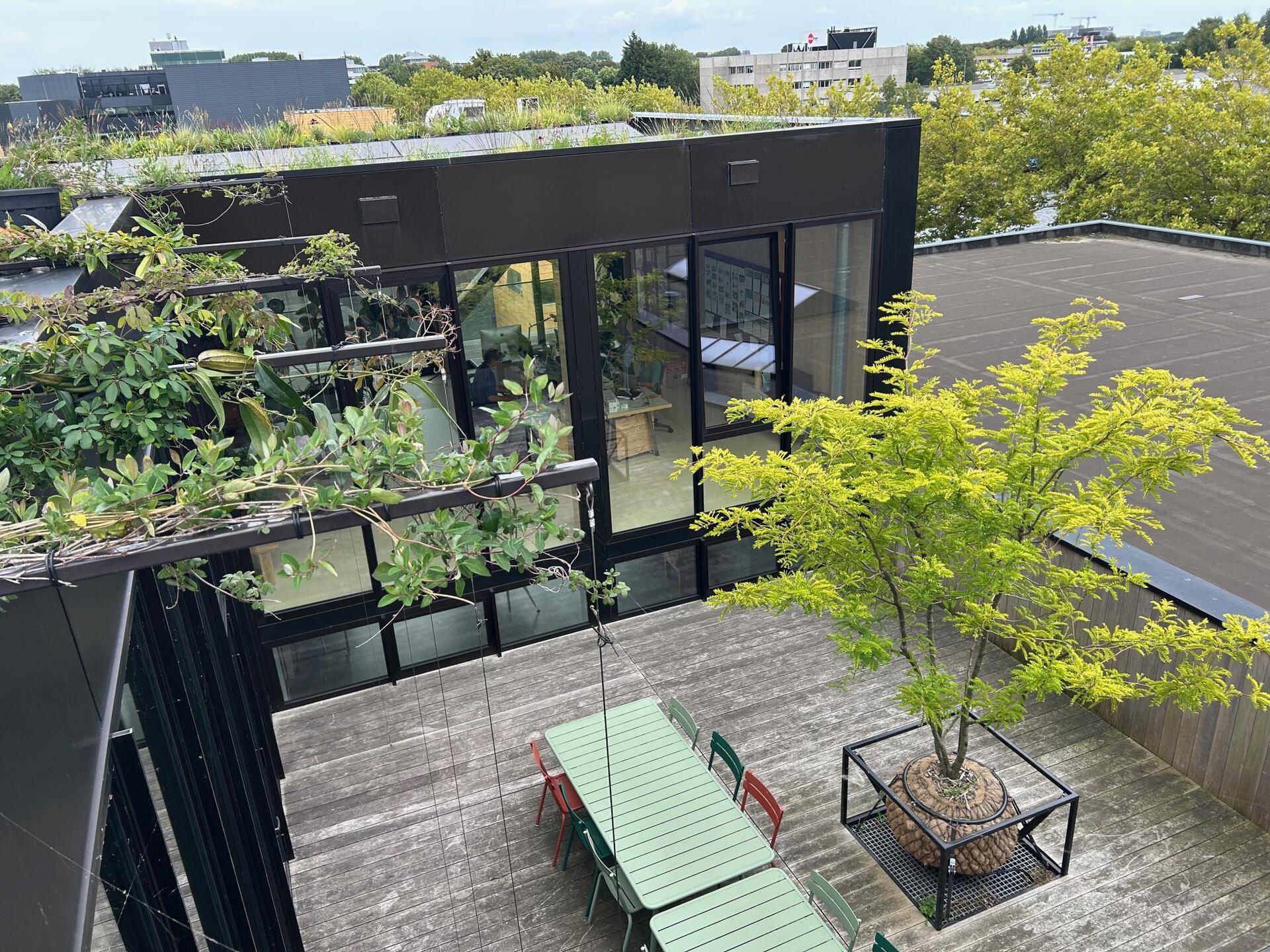 Willem Groeneveld ist von seinem neuen Arbeitsraum in Amsterdam ebenso begeistert wie von seiner Arbeit als Food-Fotograf. Seine Ambition, ein nachhaltiges neues Fotostudio zu bauen, spiegelt sich deutlich in der Gestaltung dieses schönen Holzgebäudes in Amsterdam Overamstel wider. Es war uns eine Ehre, zur Gestaltung des Innenhofs im zweiten Stock mit einer beeindruckenden, sechs Meter hohen Gleditsia triacanthos f. inermis beizutragen. Dieser Baum reflektiert das Sonnenlicht auf subtile Weise in der Glasfassade des Gebäudes.
