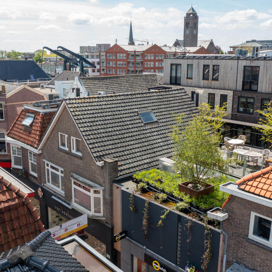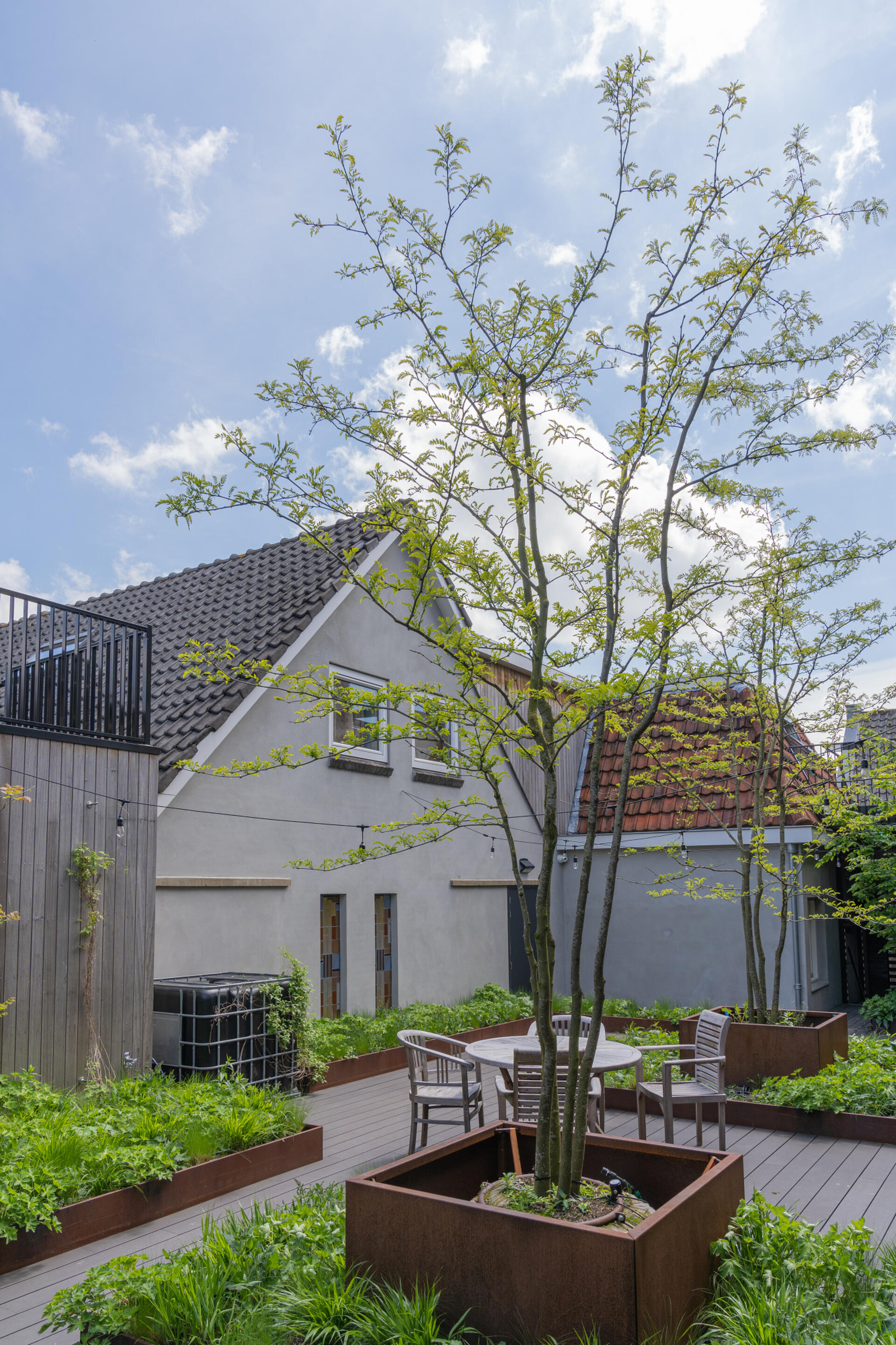 Toen de architect een daktuin plande voor de bewoners van de nieuw ontwikkelde appartementen bovenop een schoenenwinkel in Alphen aan den Rijn, hield hij geen rekening met de beperkte draagkracht van het bestaande gebouw om het gewicht van volwassen bomen te dragen. Onze Urban Trees en Jungle Boxes bleken een welkome oplossing: het resultaat is een prachtige daktuin in het centrum van Alphen aan den Rijn.